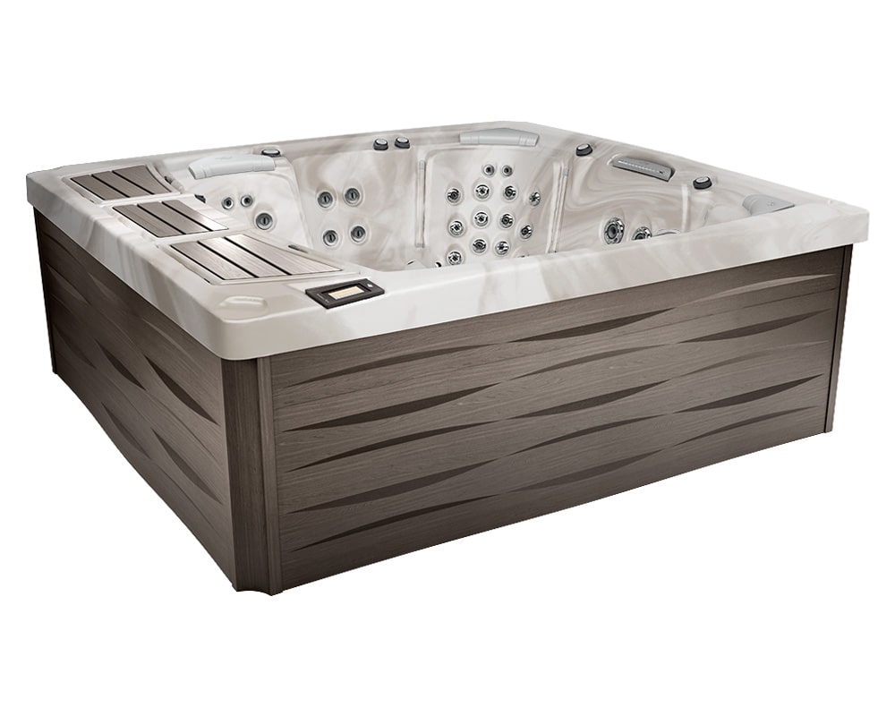Experience luxury with our hot tub geometric exterior cabinetry and architectural corner lighting. The low-profile design ensures easy entry and exit, while the lounge deck and wide, flat top rail provide extra seating space for stylish socializing. Enjoy convenience and elegance in every soak.